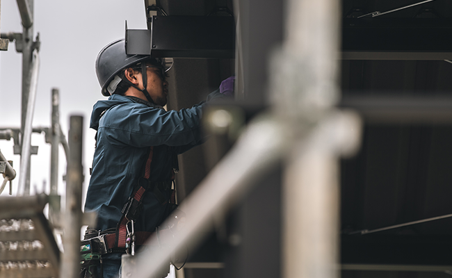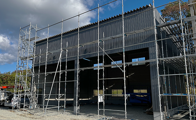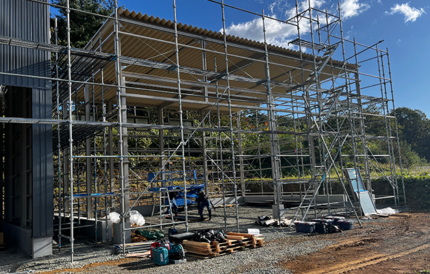 骨格となる柱や梁などの主要構造部を組み立て、屋根・壁と作業を行います。